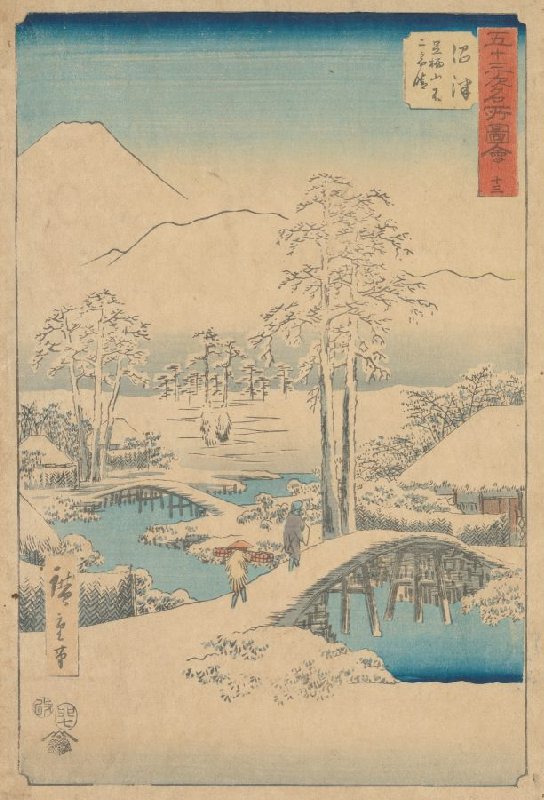 Numazu: Mount Fuji in Clear Weather After Snowfall from the Ashigara Mountains, no. 13 from the series Collection of Illustrations of Famous Places near the Fifty-Three Stations [Along the Tōkaidō]