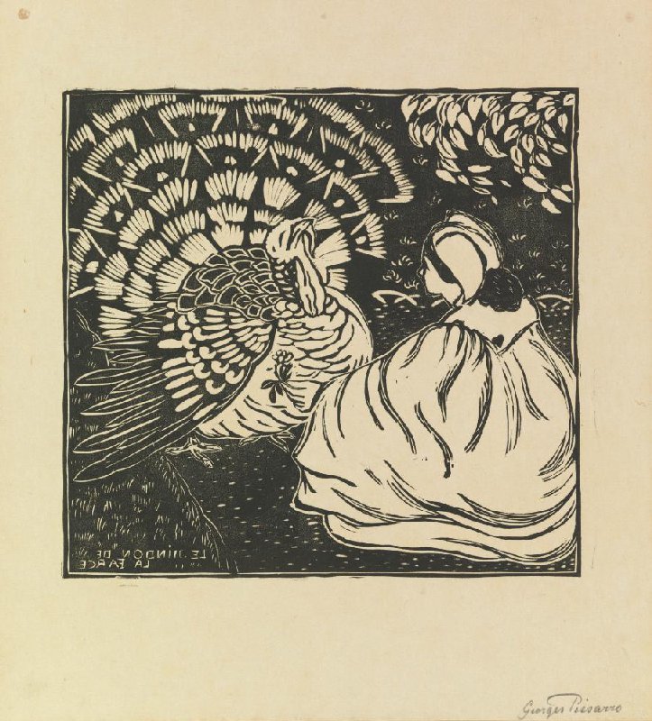 - LE DINDON DE LA FARCE by Manzana-Pissarro, George , dit is één van Georges' eerste pogingen in de houtsnijtechniek, herkenbaar aan het feit dat de titel in spiegelbeeld is afgedrukt