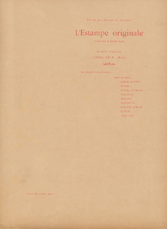 - Édition du "Journal des Artistes" ----------------------------------------- L'Estampe originale TEXTE PAR M. ROGER MARX ------------------------- DEUXIÈME LIVRAISON (AVRIL-JUIN 1893) Ont collaboré à cette Livraison: MM. AURIOL, HENRI BOUTET, DULAC, HENRI GUÉRARD, GUILLOUX, RACHOU, RAFFAELLI, ODILON REDON RODIN, SÉRUSIER.