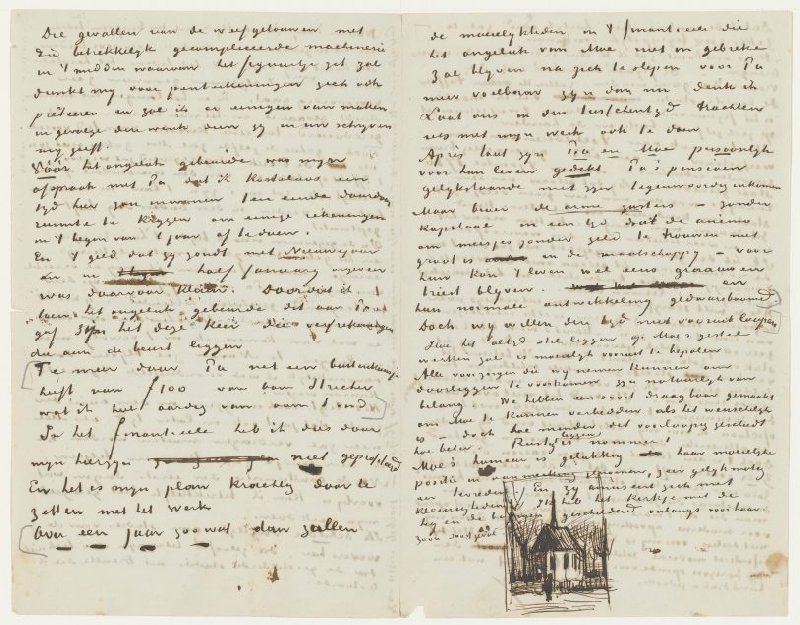 Brief van Vincent van Gogh aan Theo van Gogh met schets van De Gereformeerde kerk in Nuenen (verso)