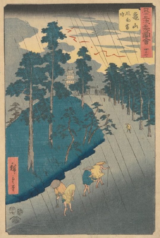 Kameyama: Wind, regen en onweer, nr. 47 uit de prentenserie Verzameling afbeeldingen van beroemde plaatsen bij de drieënvijftig stations [langs de Tōkaidō]