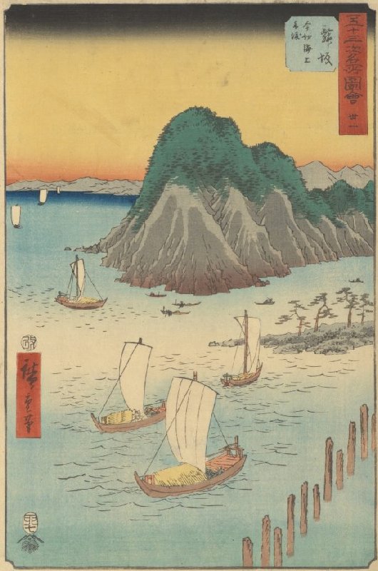 Maisaka: Veerboten op de zee bij Imagiri, nr. 31 uit de prentenserie Verzameling afbeeldingen van beroemde plaatsen bij de drieënvijftig stations [langs de Tōkaidō]