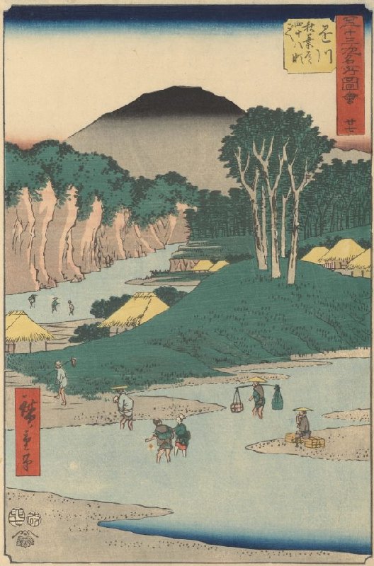 Kakegawa: Het oversteken van de 48 doorwaadbare plaatsen langs de Akiba weg, nr. 27 uit de prentenserie Verzameling afbeeldingen van beroemde plaatsen bij de drieënvijftig stations [langs de Tōkaidō]