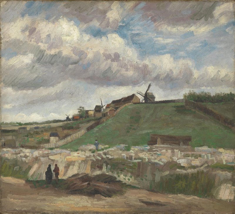 De Parijse wijk Montmartre staat bekend als kunstenaarsbuurt. Dat was ook al zo in Van Goghs tijd. Maar de heuvel waarop de wijk ligt, was toen nog maar aan één kant bebouwd. De andere kant schilderde hij hier. Je ziet de steengroeves en het uitzicht op de molens die al in het verstedelijkte deel verderop waren opgenomen. Op de voorgrond ligt een stapel hout, daarachter staan steenblokken.