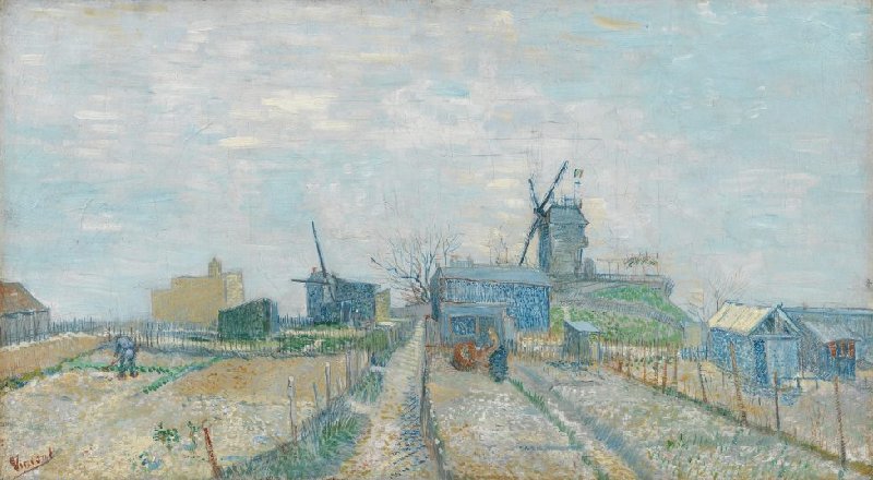 Van Gogh schilderde in Parijs regelmatig de pittoreske molens op de heuvel van Montmartre. In zijn tijd was Montmartre nog een half landelijk gebied, met moestuinen en landerijen. Van Gogh hoopte dat het onderwerp makkelijk zou verkopen. De frisse, zuivere kleuren – het wit in de velden, het heldere blauw van de schuurtjes – ontleende hij aan eigentijdse Franse kunst. Om ‘zonlicht’ in zijn landschap te brengen, gebruikte Van Gogh sterk verdunde olieverf. Dat leverde een transparant en mat effect op. Hij koos een opvallend langgerekt formaat doek. Dit geeft het effect geeft van een groothoek-opname. Een waaier van paden en moestuinen voert onze blik naar de horizon.