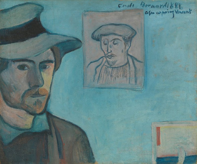 Van Gogh had zijn twee vrienden gevraagd om elkaar te portretteren. Maar de 20-jarige Bernard was geïmponeerd door de tweemaal zo oude Gauguin en durfde het niet aan. Ze stuurden daarom elk een zelfportret waarin een schets van de ander was opgenomen. Naast zijn signatuur zette Bernard een opdracht aan zijn vriend (‘copain’) Van Gogh. De ‘g’ achter copain was een grapje over het accent van de Provence, waar Van Gogh woonde.
