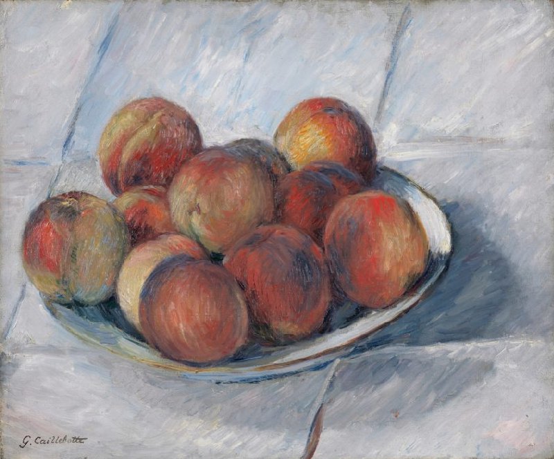De uitgesproken kleuren van de perziken krijgen extra nadruk door het sprankelende wit van de ondergrond. Of het een tafellaken is of toch witte plavuizen zijn blijft gissen, door de afsnijding van de compositie. Caillebotte creëerde zo een platheid geïnspireerd door de toen zeer populaire Japanse prentkunst. Zelfs met een traditioneel genre als het stilleven toont Caillebotte zo zijn uitgesproken moderne benadering.