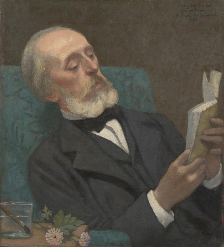 Puvis de Chavannes schilderde zijn goede vriend Eugène Benon in huiselijke sfeer, verdiept in een populaire roman. Zijn verziendheid dwingt Benon achterover te leunen en het boek op een afstandje te houden.